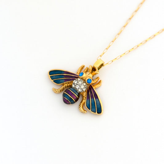 Vintage Blue Purple Enamel Rhinestone Bee Necklace