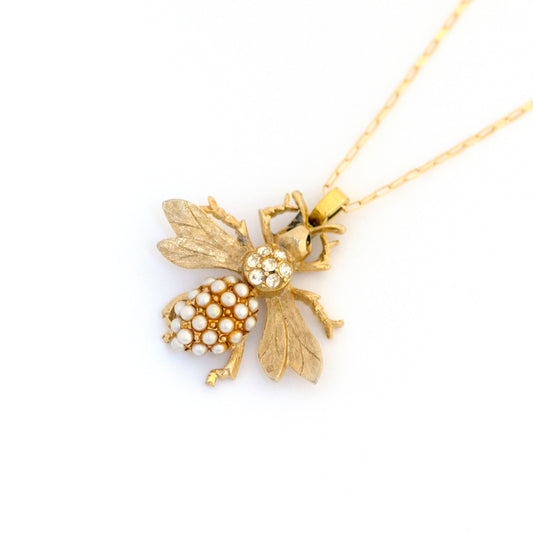 Vintage Pearl Glass and Rhinestone Bumble Bee Necklace
