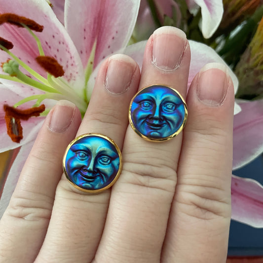 Czech Glass Button Vermeil Ring - Blue Moon Face Purple Pink Glow