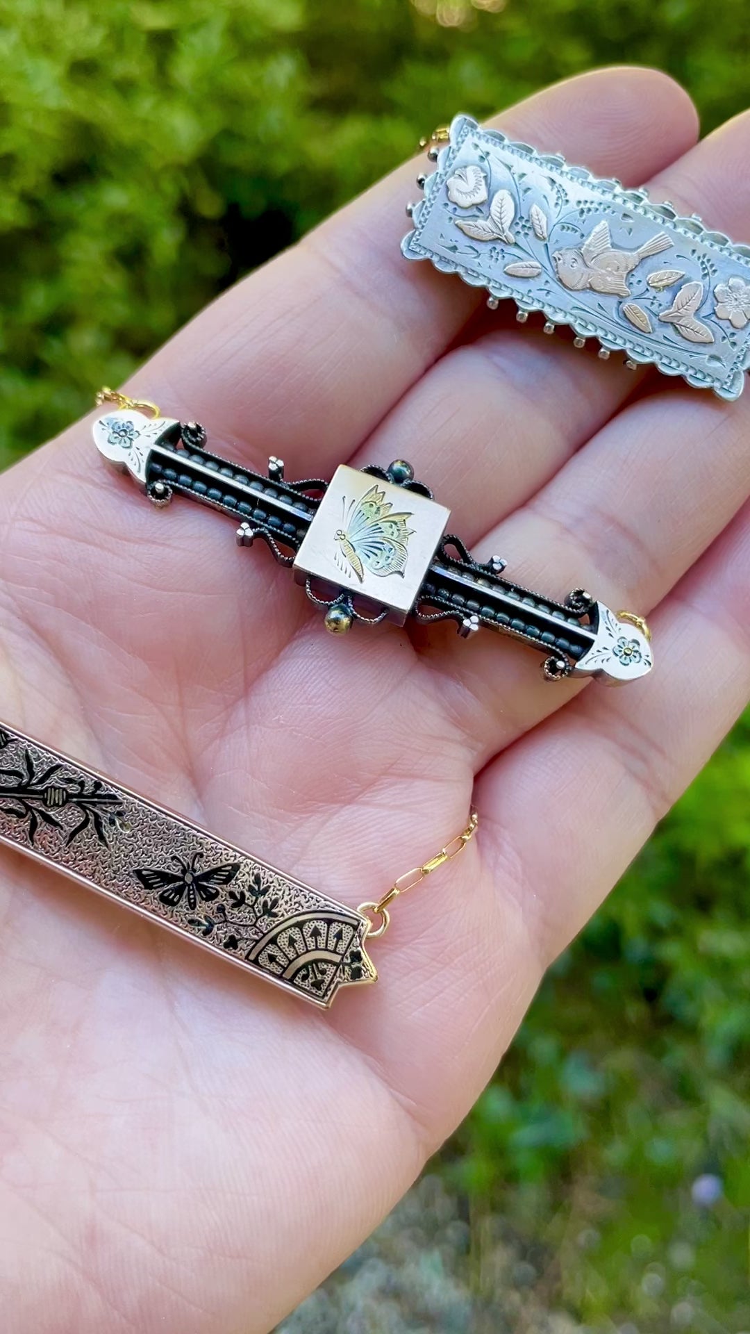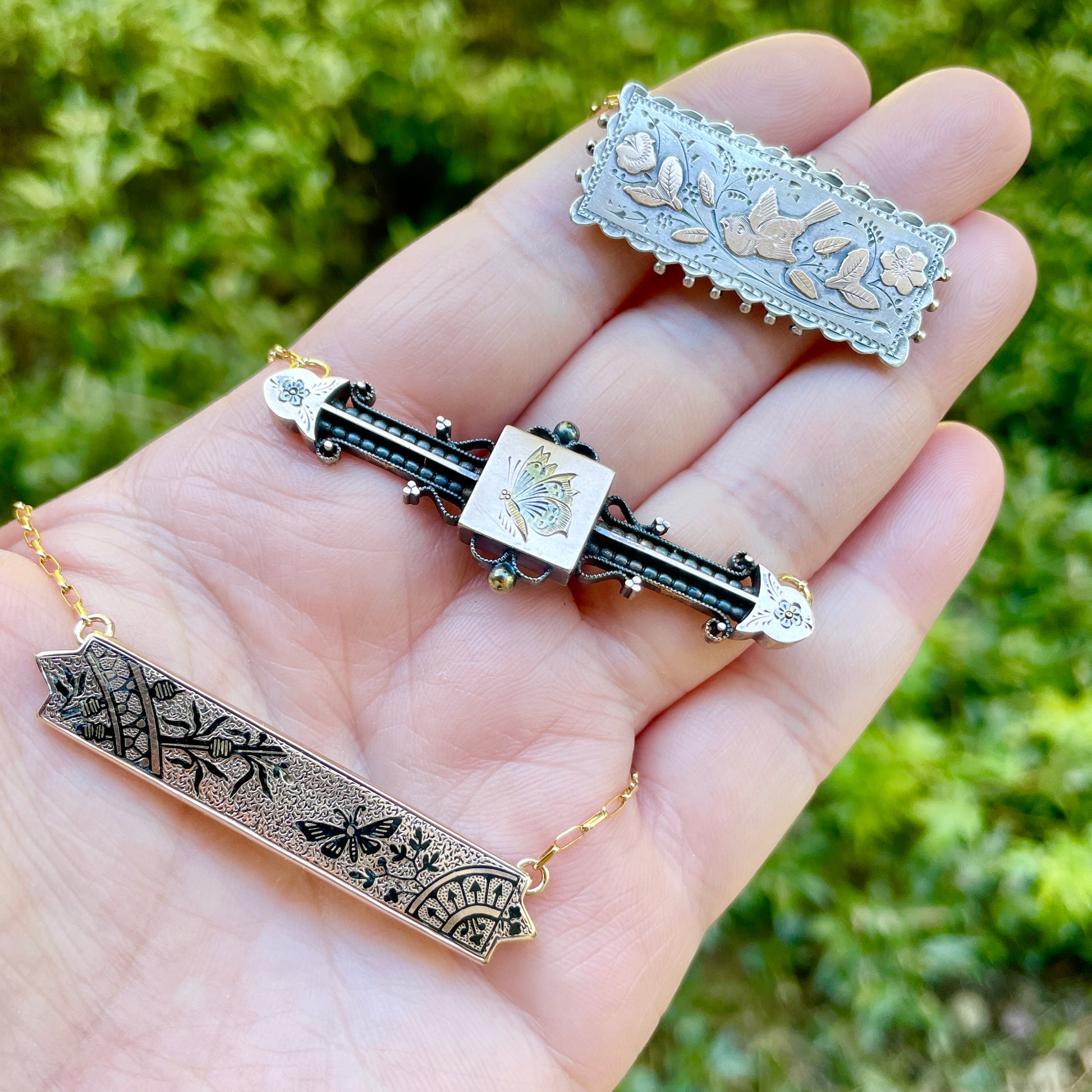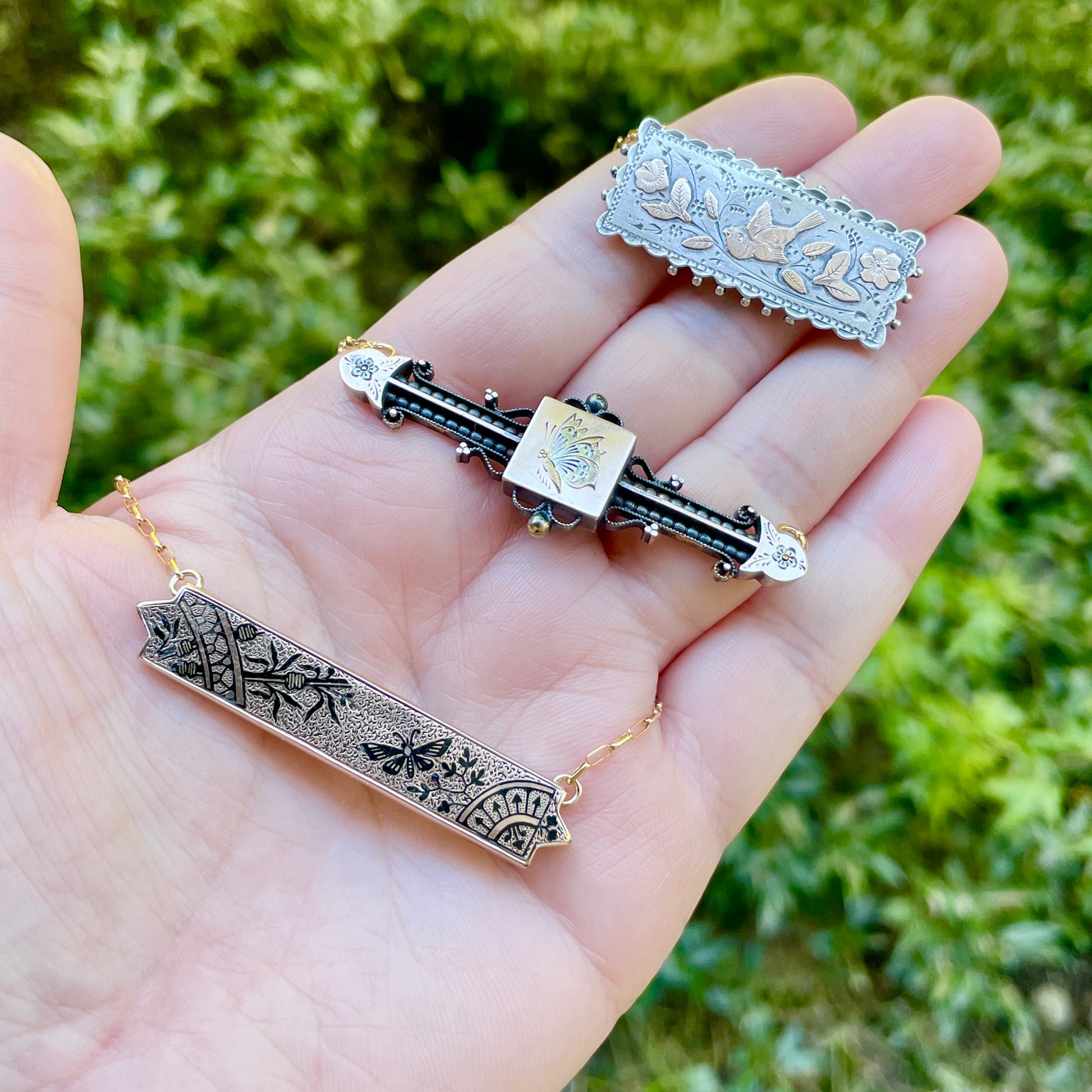 10k gold Victorian bar pin pendant from the late 1800s with taille d'epargne (black enamel tracery) depicting a firefly or butterfly, bamboo and fan imagery. Pendant measures 2.1" wide.