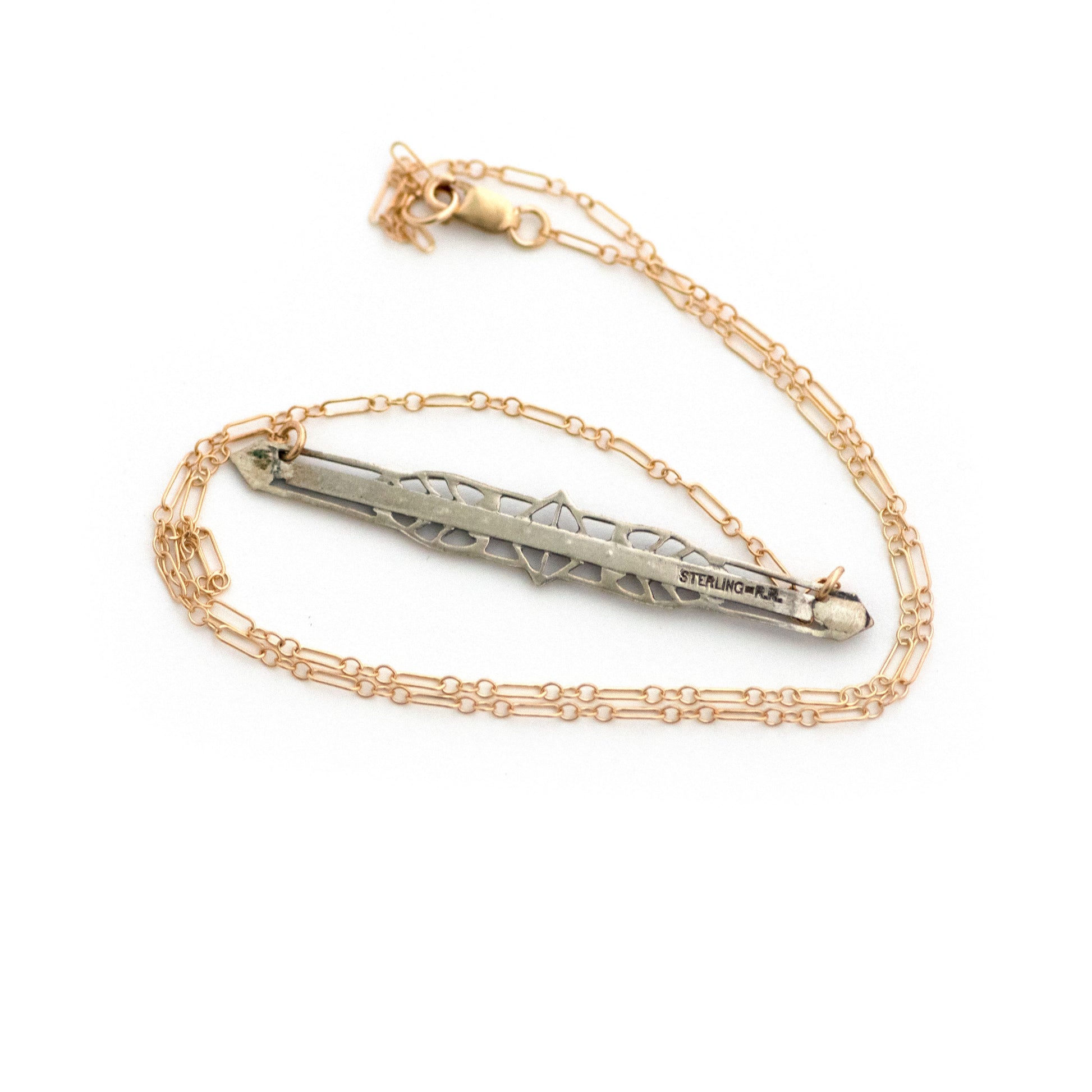 Gold filled Edwardian bar pin pendant from the early 1900s with paste stones in alternating citrine and clear colors. Pendant measures 2.2" wide. Hallmarked "STERLING" on the back.