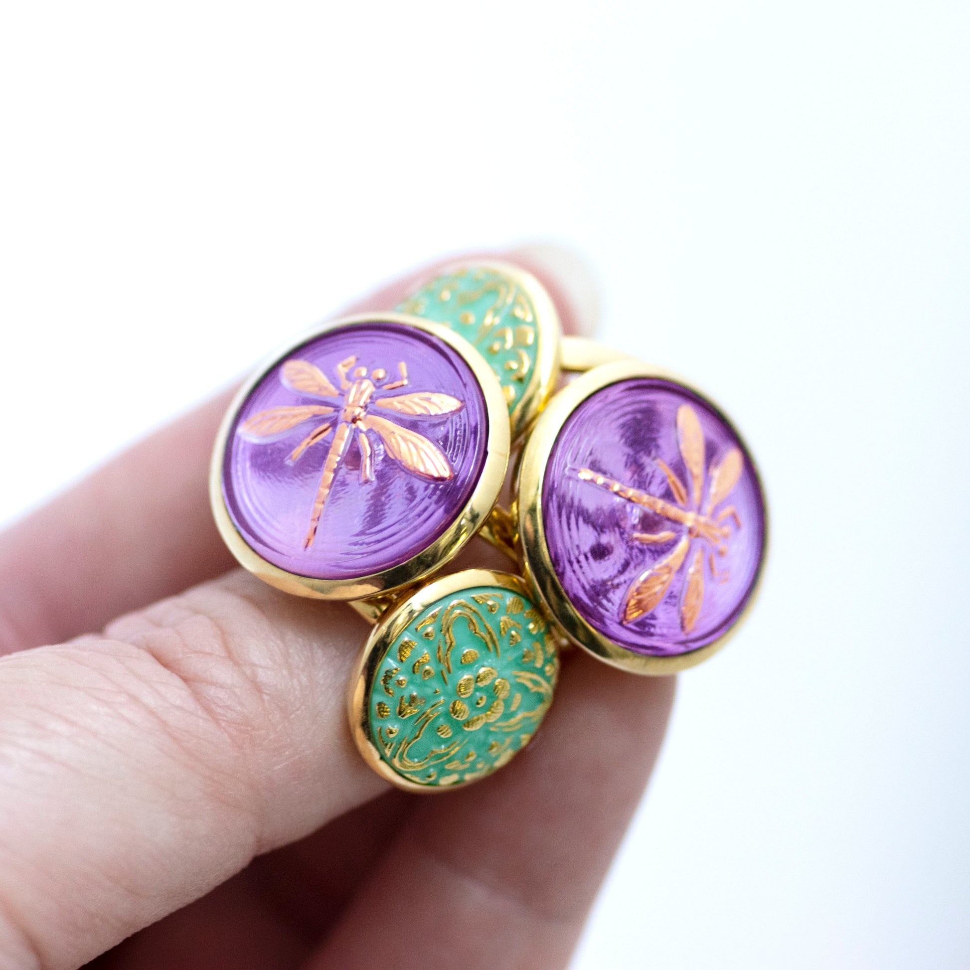 Czech glass buttons are hand pressed from antique iron molds, hand finished and hand painted in one of the few remaining factories that still produce this art in the Czech Republic. Purple and 24k painted gold dragonfly Czech glass button.