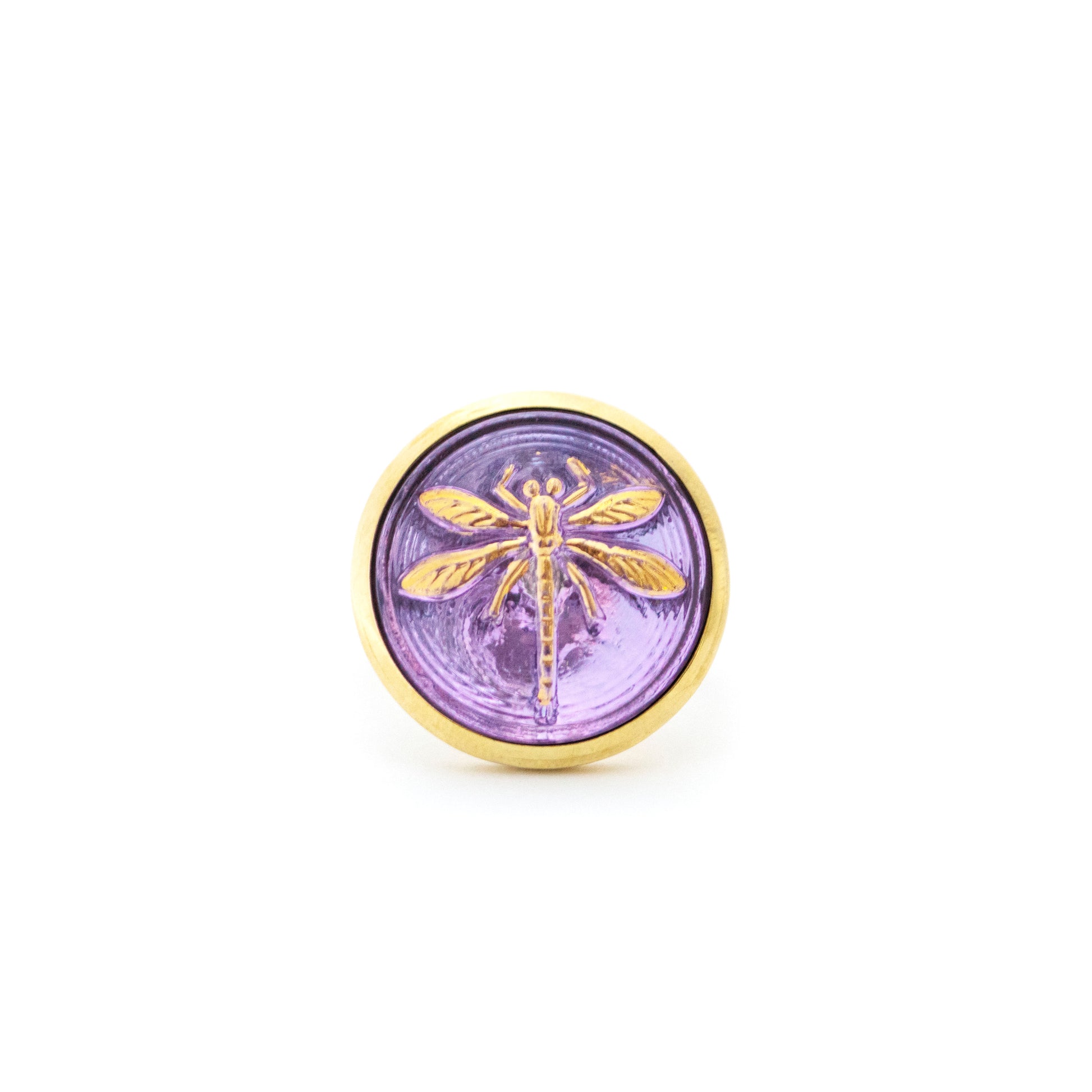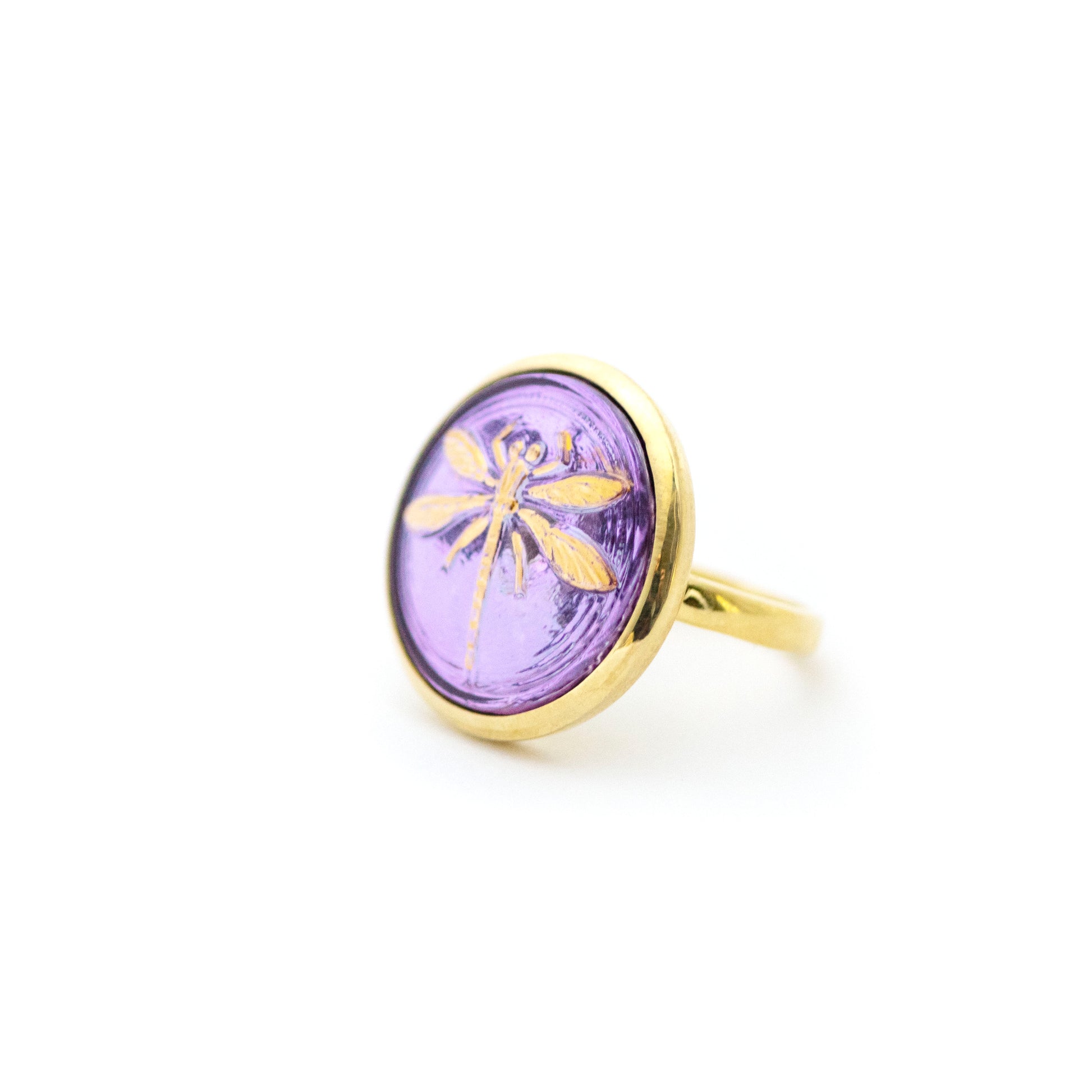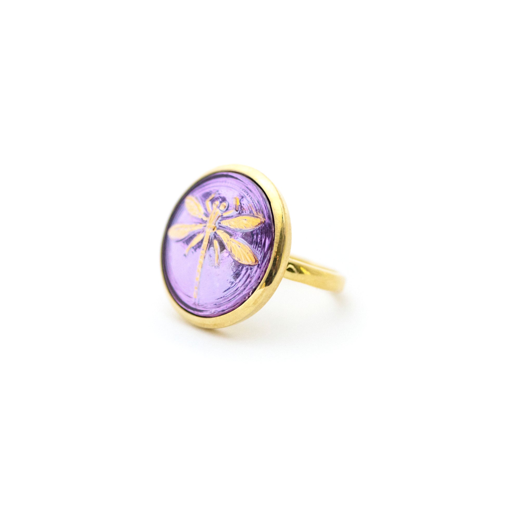 Czech Glass Button Vermeil Ring - Purple & Gold Dragonfly