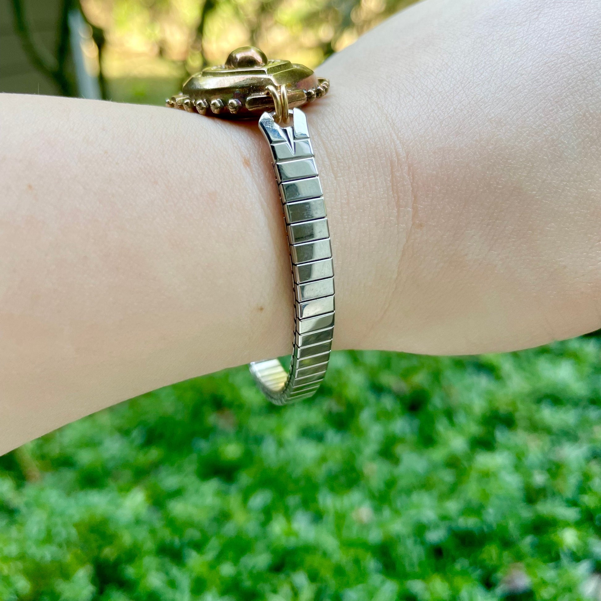 A gold filled antique brooch pin has been repurposed as a bracelet to be more wearable today. Gold fill shows wear. Empty locket on the back side with intact glass cover and locket casing.