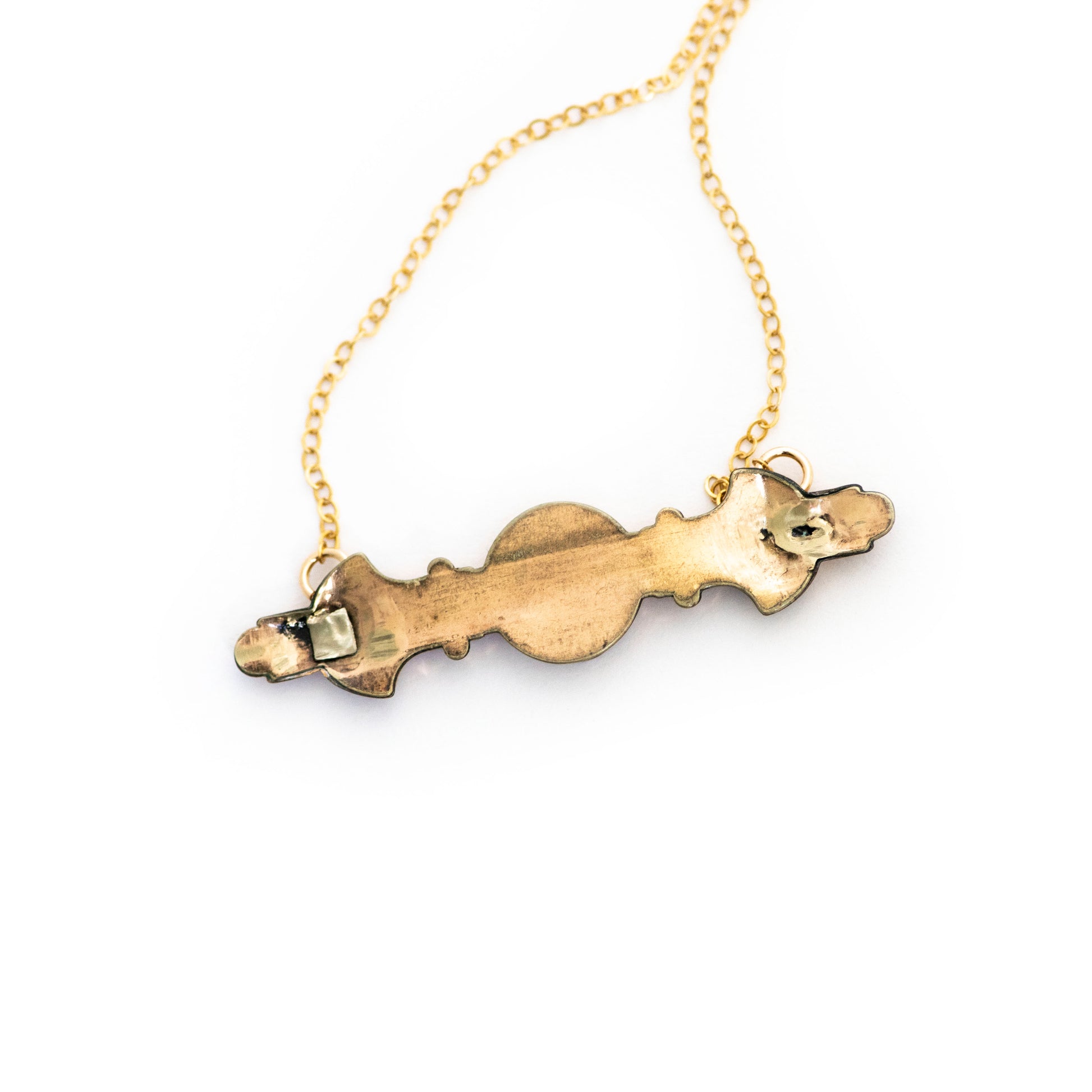 Gold filled Victorian bar pin pendant from the late 1800s with hand engraved details and a padlock design. Pendant measures 2" wide.