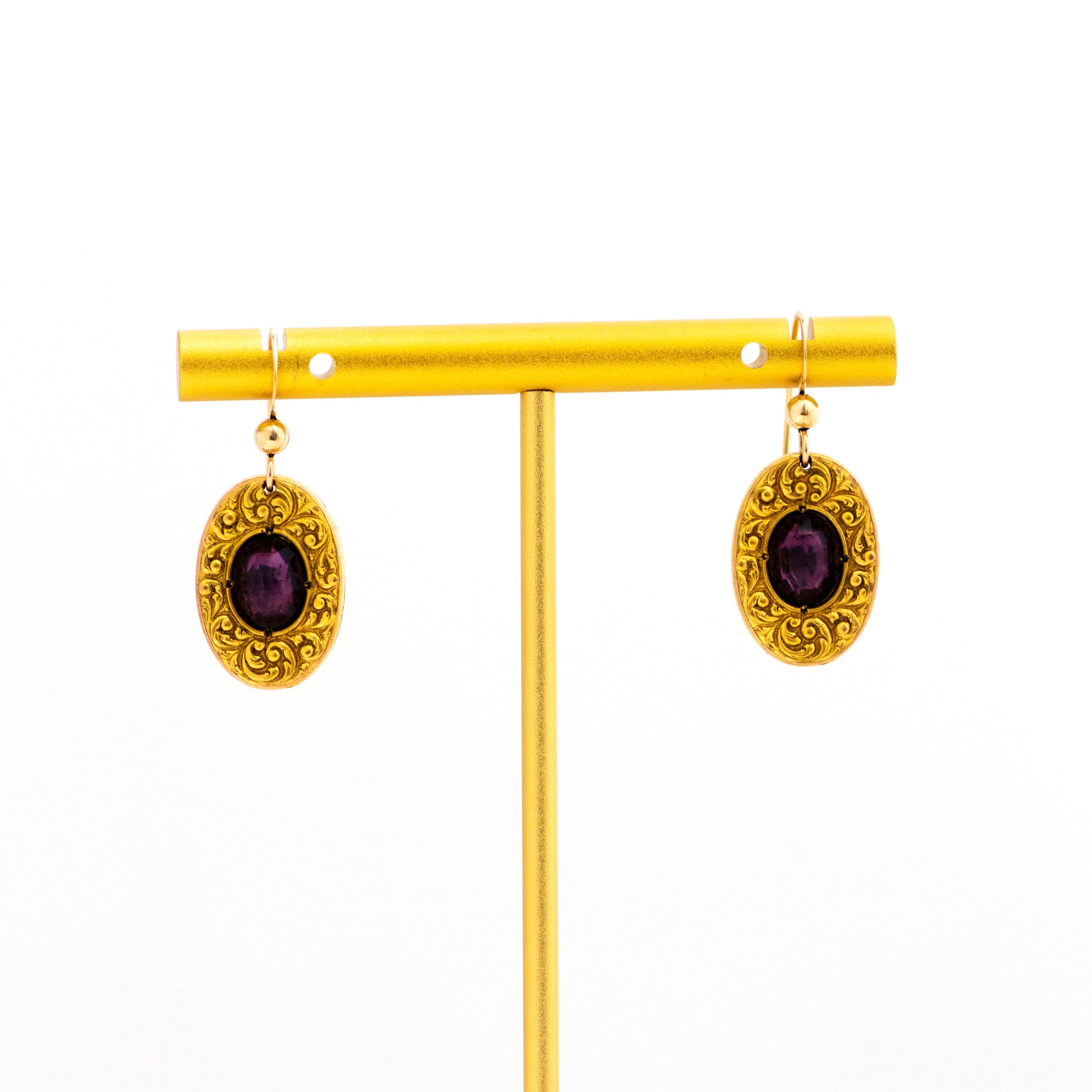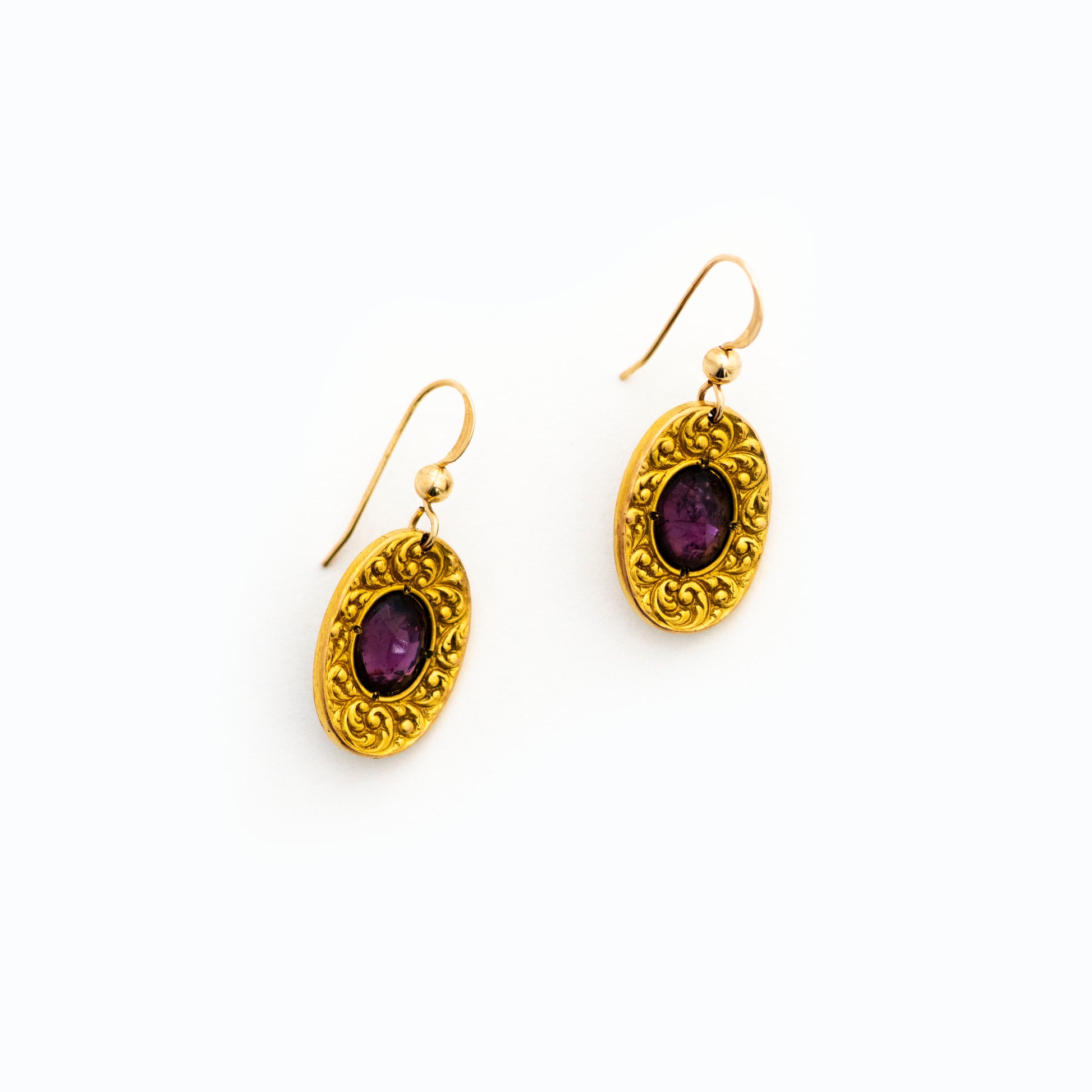 A pair of beautiful gold-filled antique cuff links from the Victorian era has been converted into earrings. Purple paste stones,