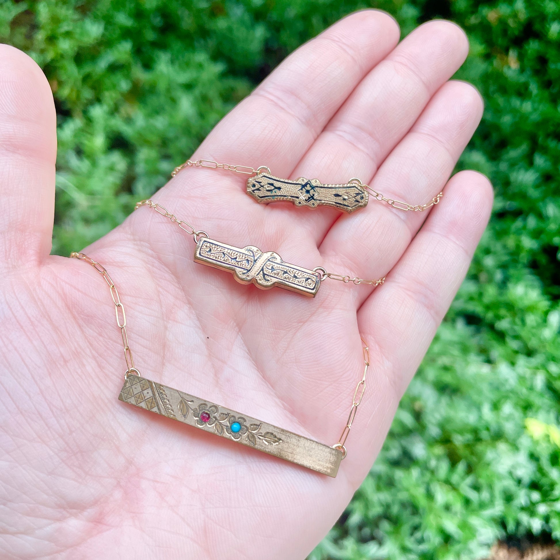 Gold filled Victorian bar pin pendant from the late 1800s with hand tooled details. Pendant measures 1.1".