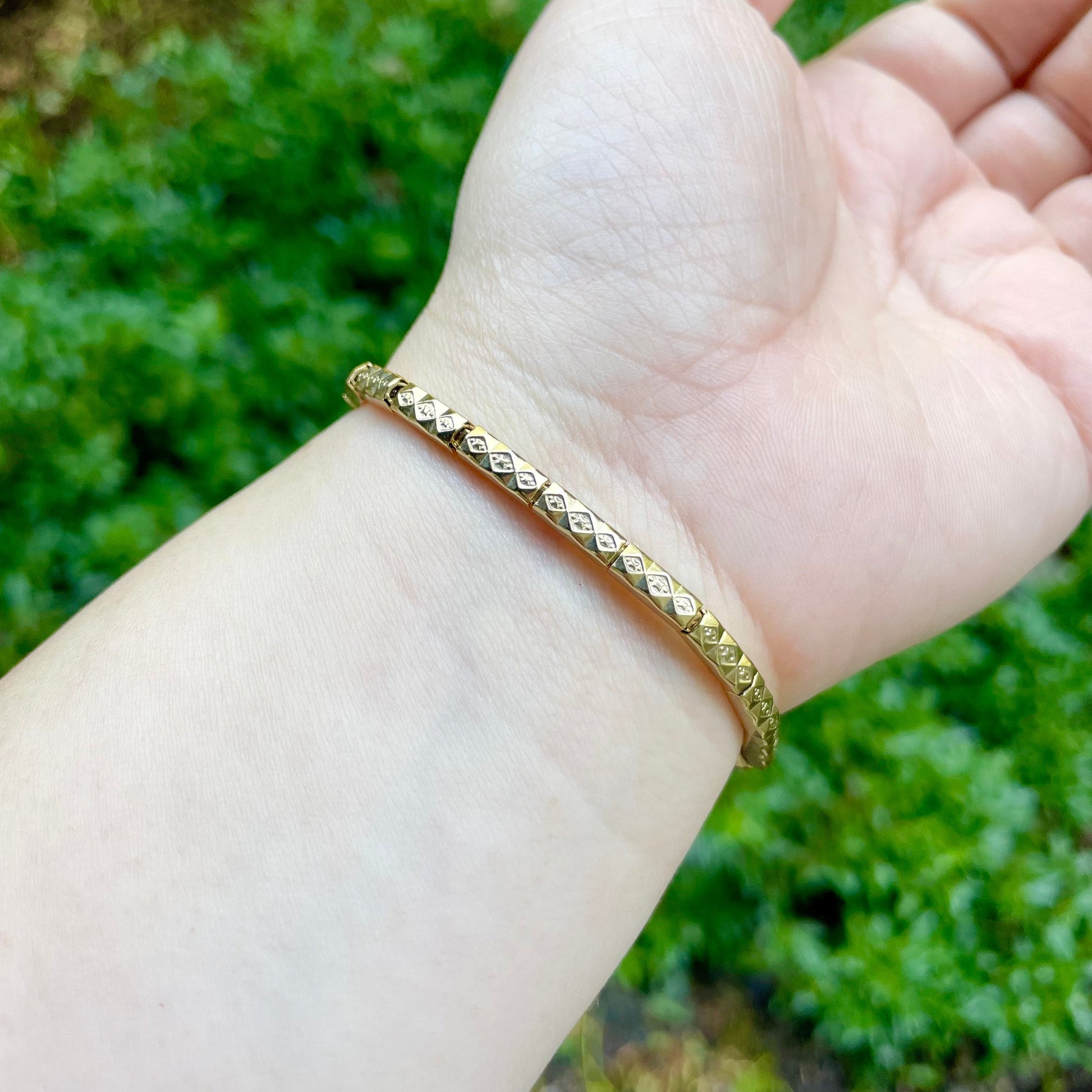 A gold-filled antique brooch pin has been repurposed as a bracelet to be more wearable today.
